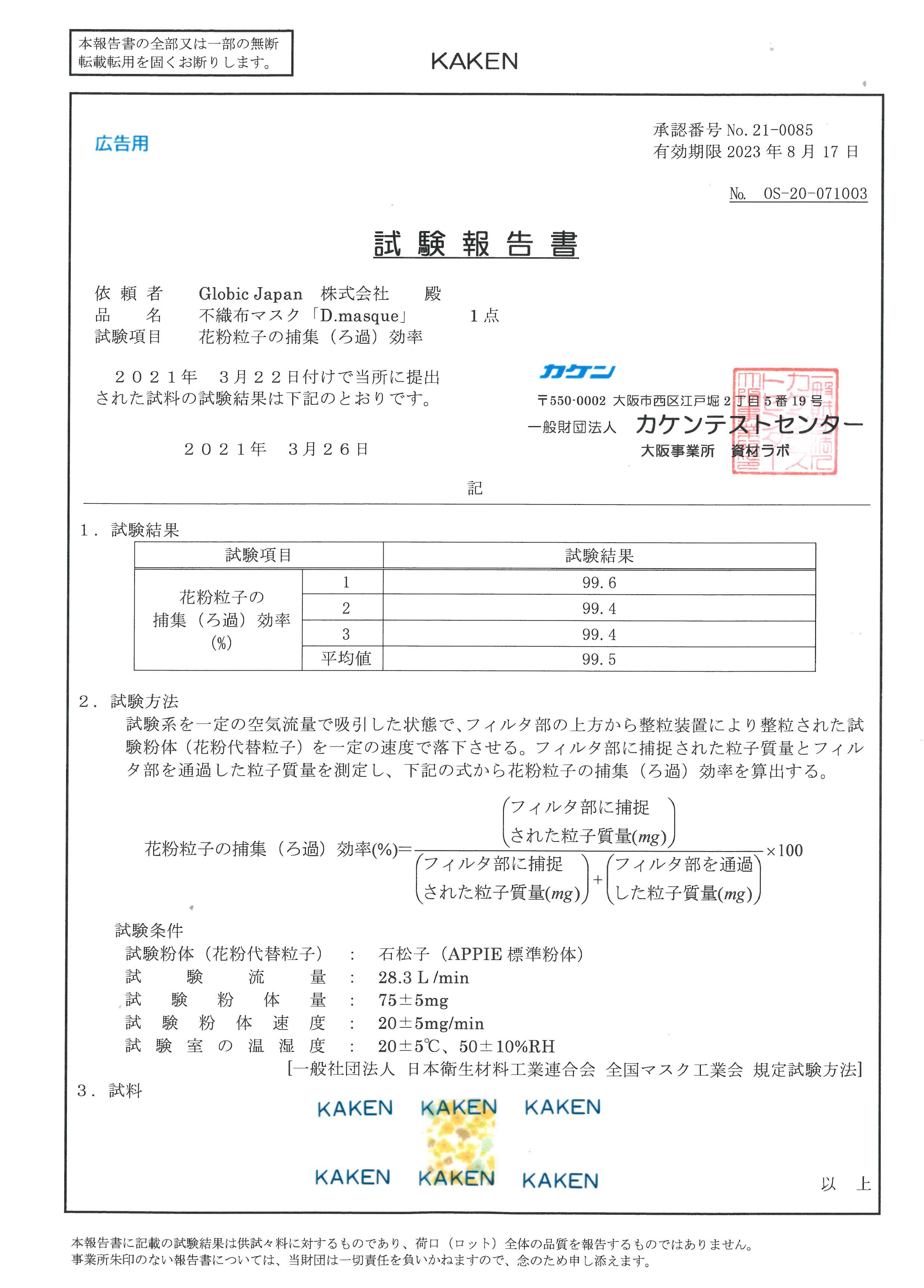 ※ 「PFE」「VFE」「BFE」「花粉粒子の捕集(ろ過)効率」「抗菌性」検査結果(一般財団法人カケンテストセンターより)