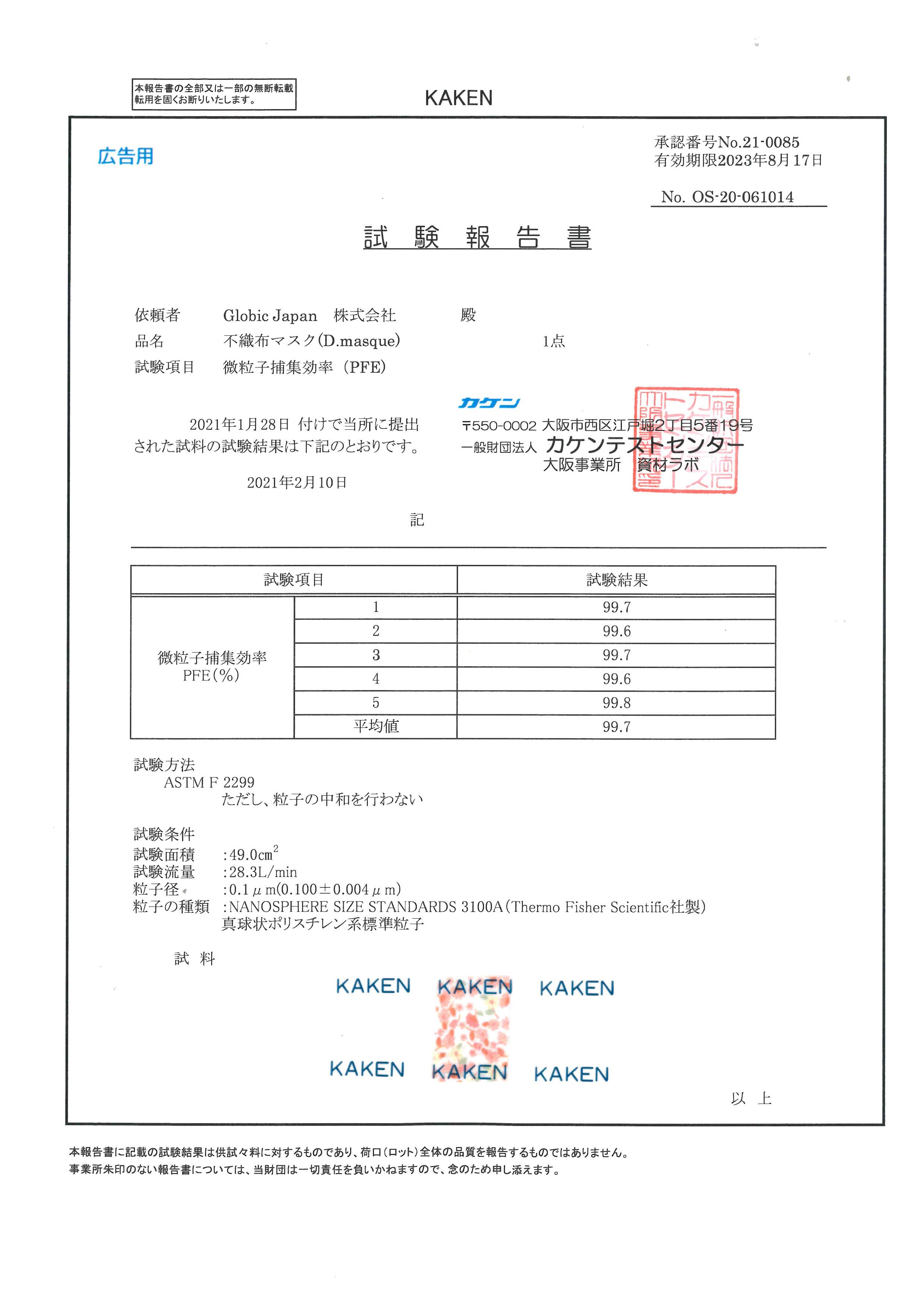 ※ 「PFE」「VFE」「BFE」「花粉粒子の捕集(ろ過)効率」「抗菌性」検査結果(一般財団法人カケンテストセンターより)