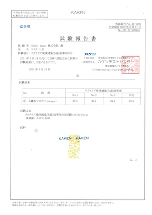 ※ 「PFE」「VFE」「BFE」「花粉粒子の捕集(ろ過)効率」「抗菌性」検査結果(一般財団法人カケンテストセンターより)