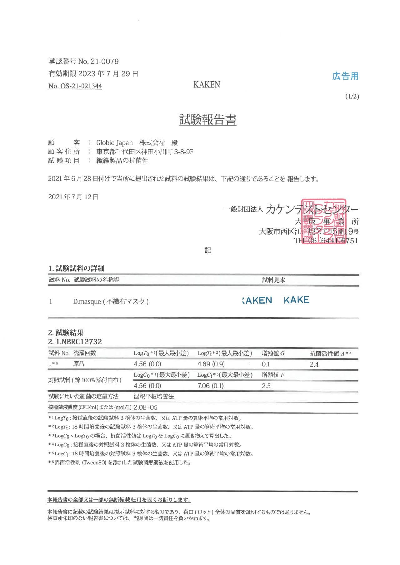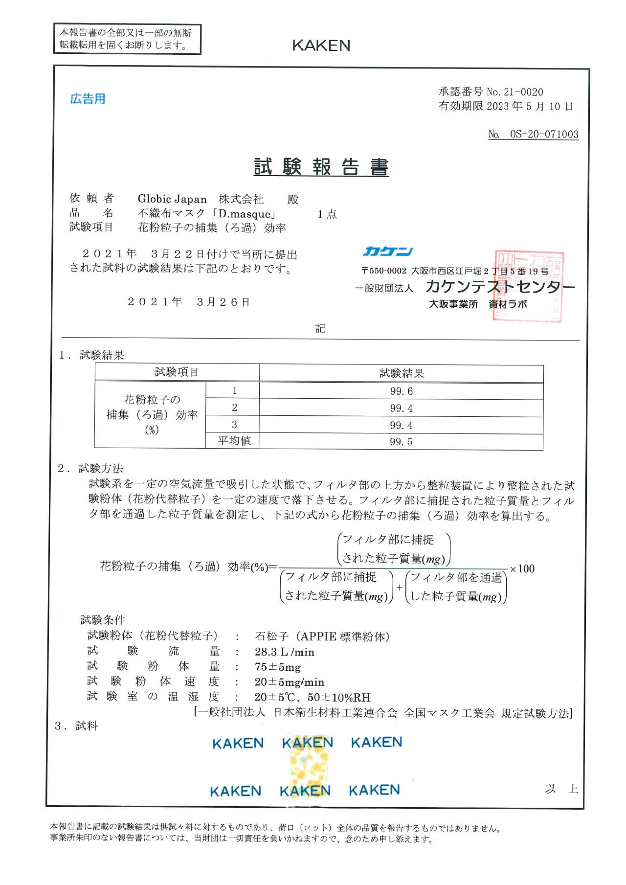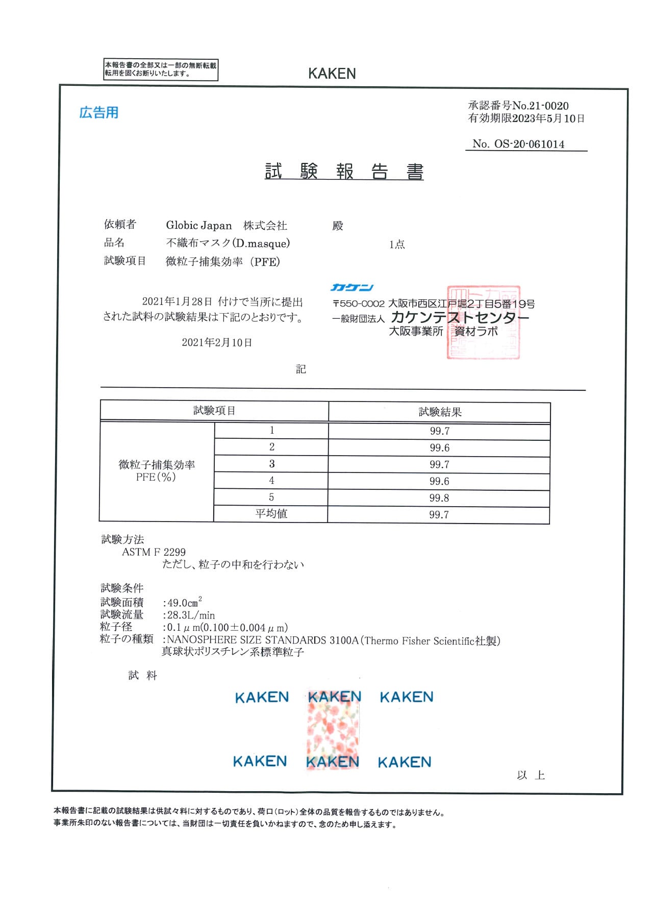 ※ 「PFE」、「VFE」、「花粉粒子の捕集(ろ過)効率」、「抗菌性」検査結果(一般財団法人カケンテストセンターより)