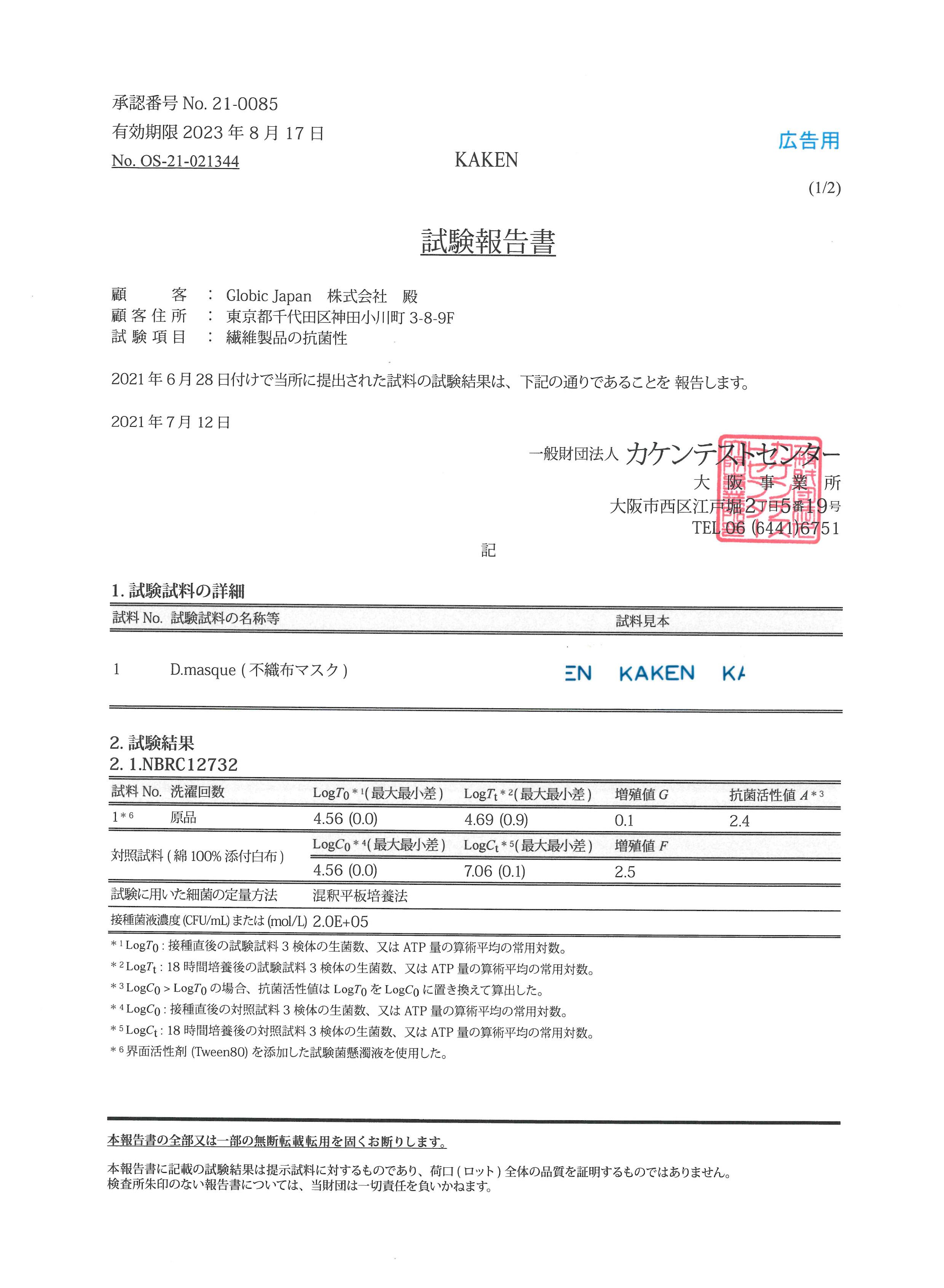 ・D.masqueは抗菌防臭加工により繊維上の細菌増殖を抑制し、防臭効果があります。(抗菌性試験は中間層の不織布にて実施)