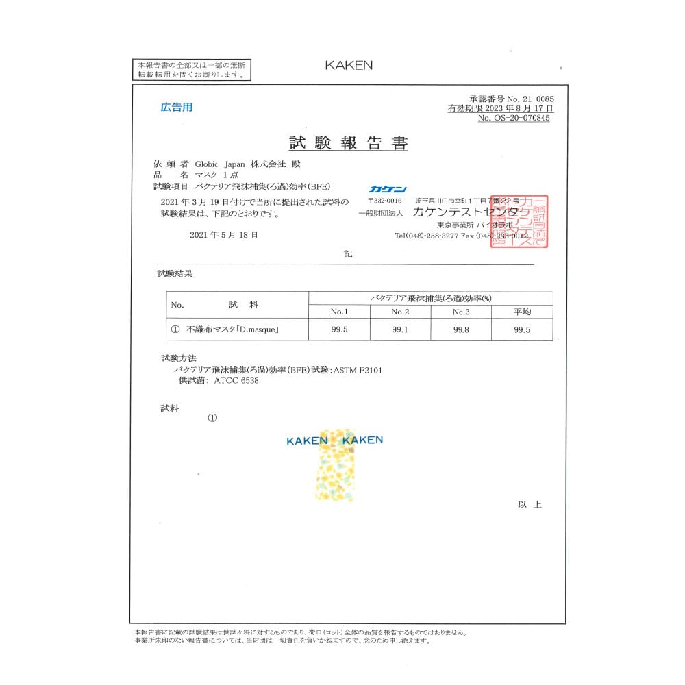 ※ 「PFE」「VFE」「BFE」「花粉粒子の捕集(ろ過)効率」「抗菌性」検査結果(一般財団法人カケンテストセンターより)