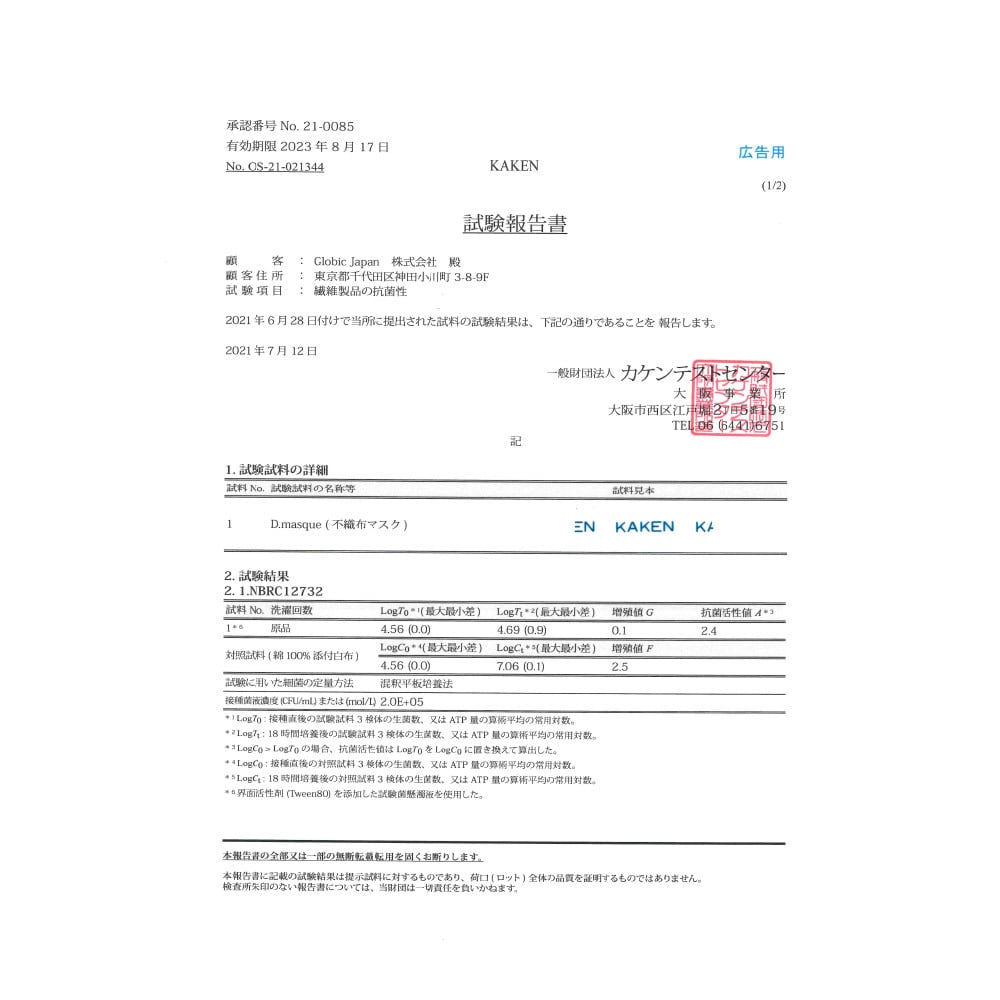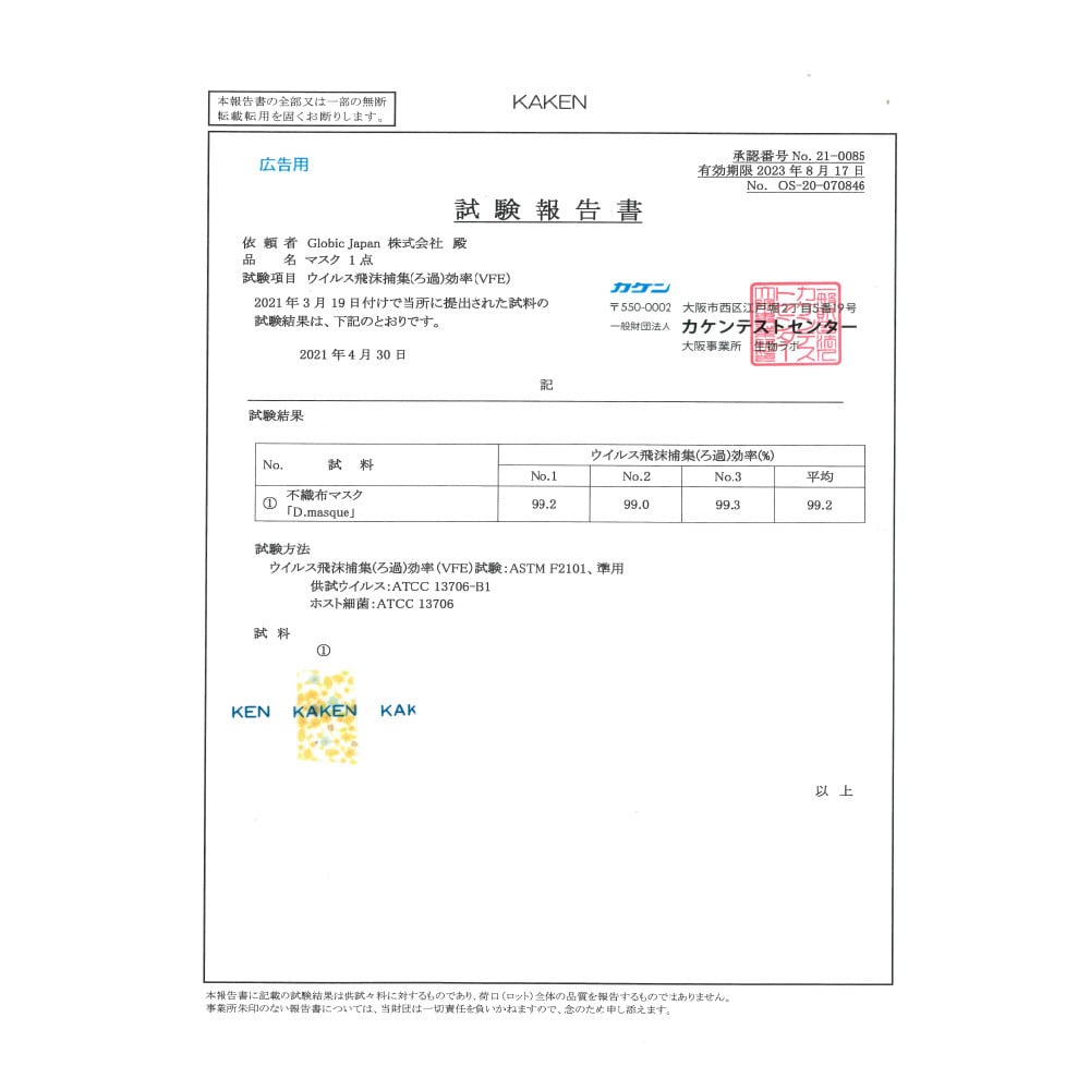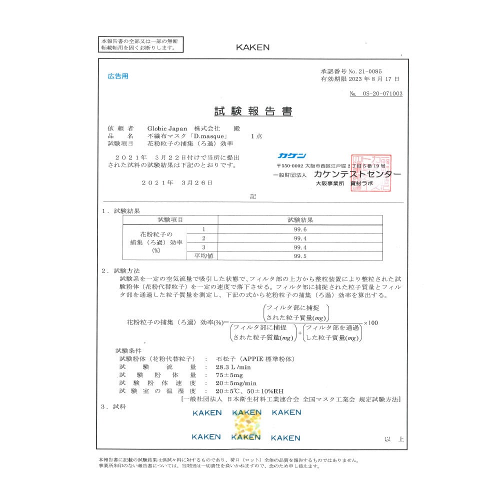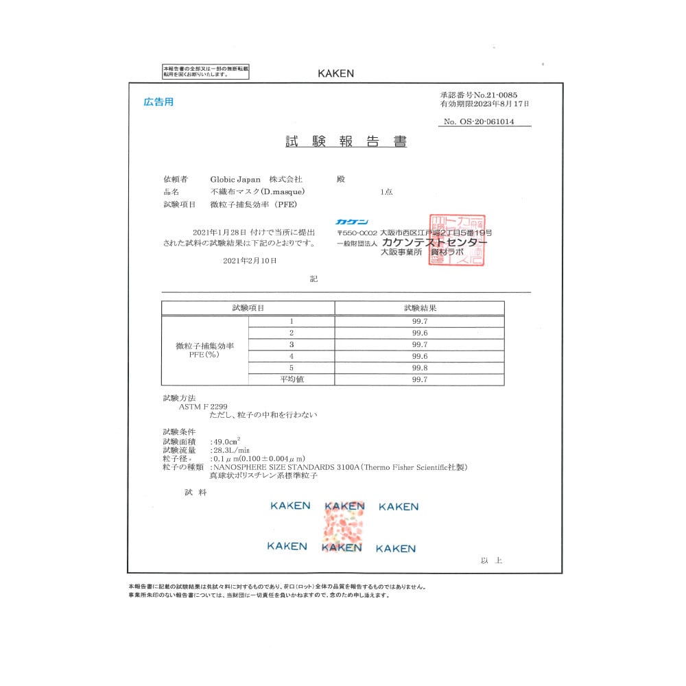 ※ 「PFE」「VFE」「BFE」「花粉粒子の捕集(ろ過)効率」「抗菌性」検査結果(一般財団法人カケンテストセンターより)